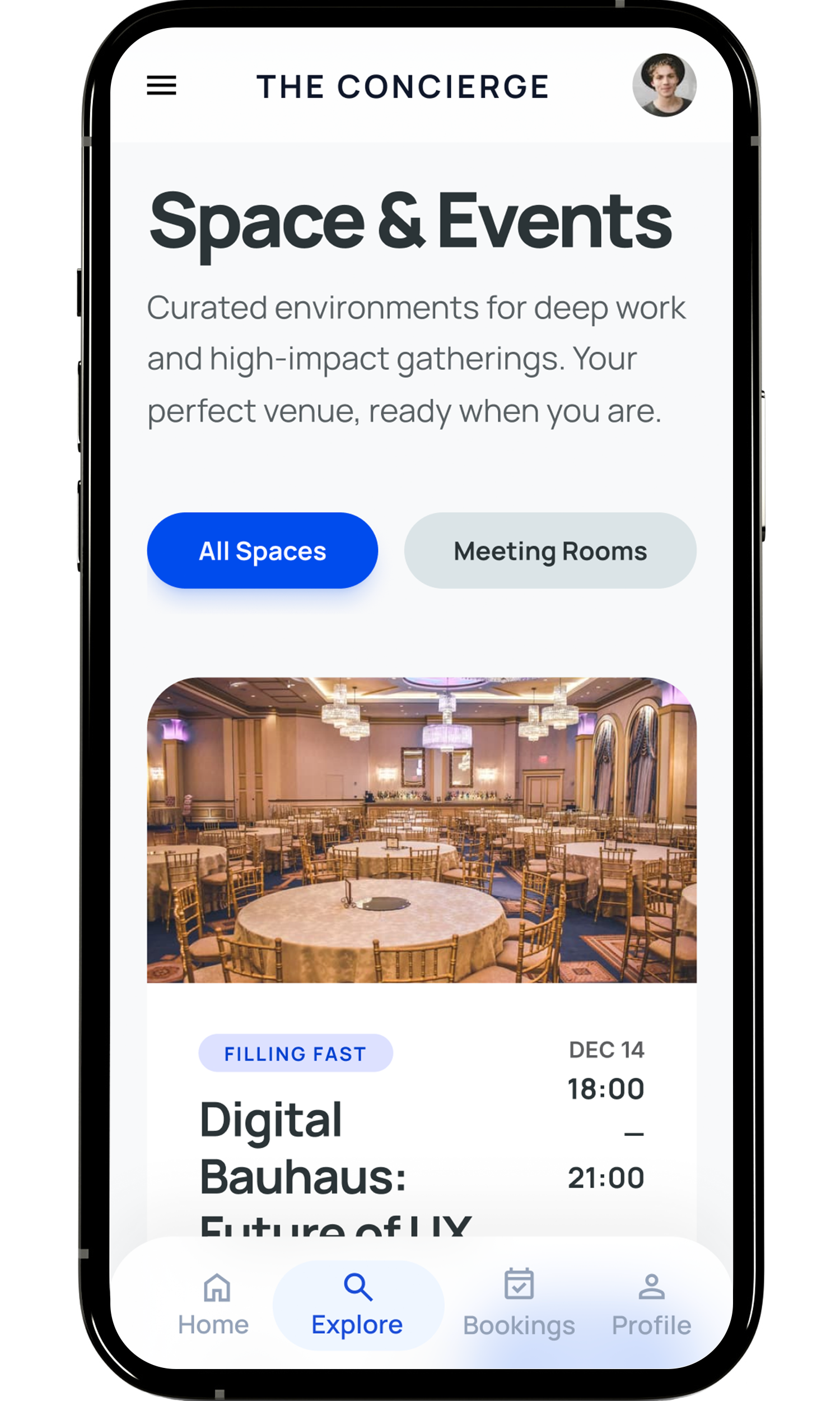 Users can quickly browse available spaces and events with clear availability and timing.